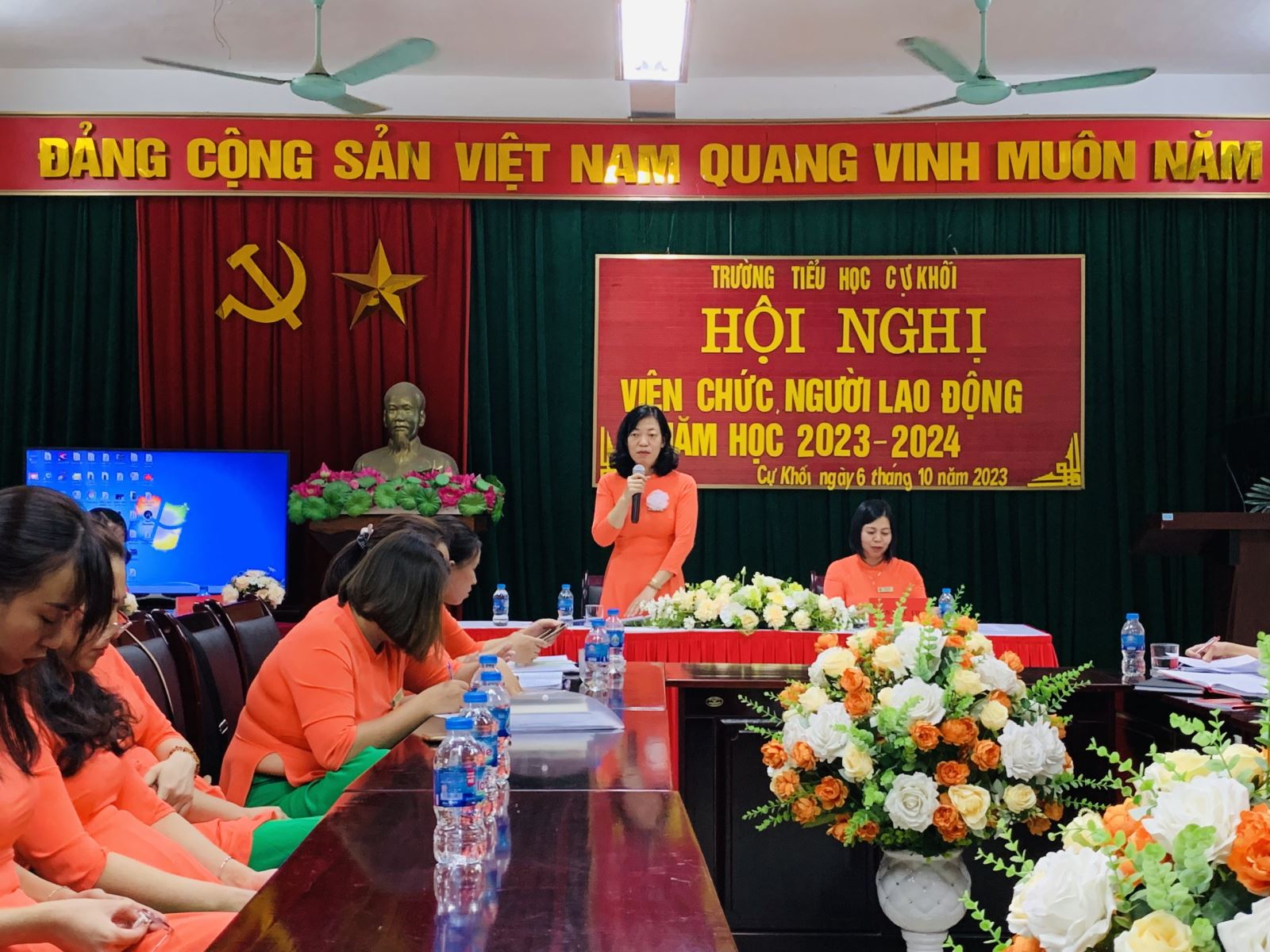 Sáng ngày 6/10/2023, Trường Tiểu học Cự Khối long trọng tổ chức Hội nghị viên chức, người lao động năm học 2023-2024. Tham dự và chủ trì Hội nghị có đồng chí Hoảng Thị Bích Liên- Bí thư Chi bộ, Hiệu trưởng Nhà trường; đồng chí Ngô Thị Hiền – Chủ tịch công đoàn; cùng các cán bộ, công chức, viên chức nhà trường.