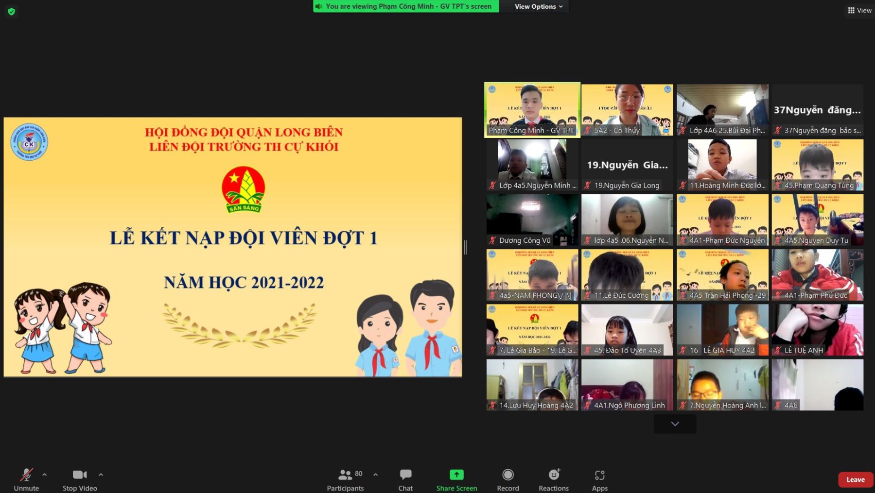 Hình ảnh các thầy cô giáo và các em học sinh dự lễ kết nạp Đội online