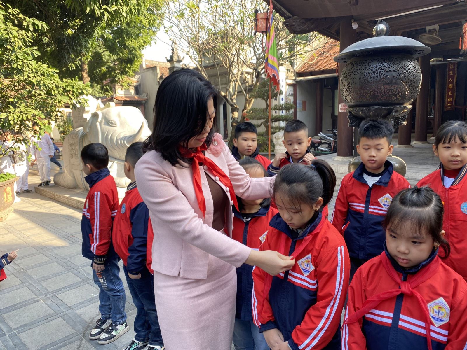 Tiếp theo sau đó cô giáo Hoàng Thị Bích Liên – Hiệu trưởng nhà trường, cô giáo Hoàng Thị Thanh Bình - Phó hiệu trưởng nhà trường; cô giáo Vũ Trang Diễm – Giáo viên TPT Đội lên trao khăn cho các bạn đội viên mới đại diện cho các lớp khối 3, các bạn còn lại sẽ được cô giáo chủ nhiệm trao khăn.