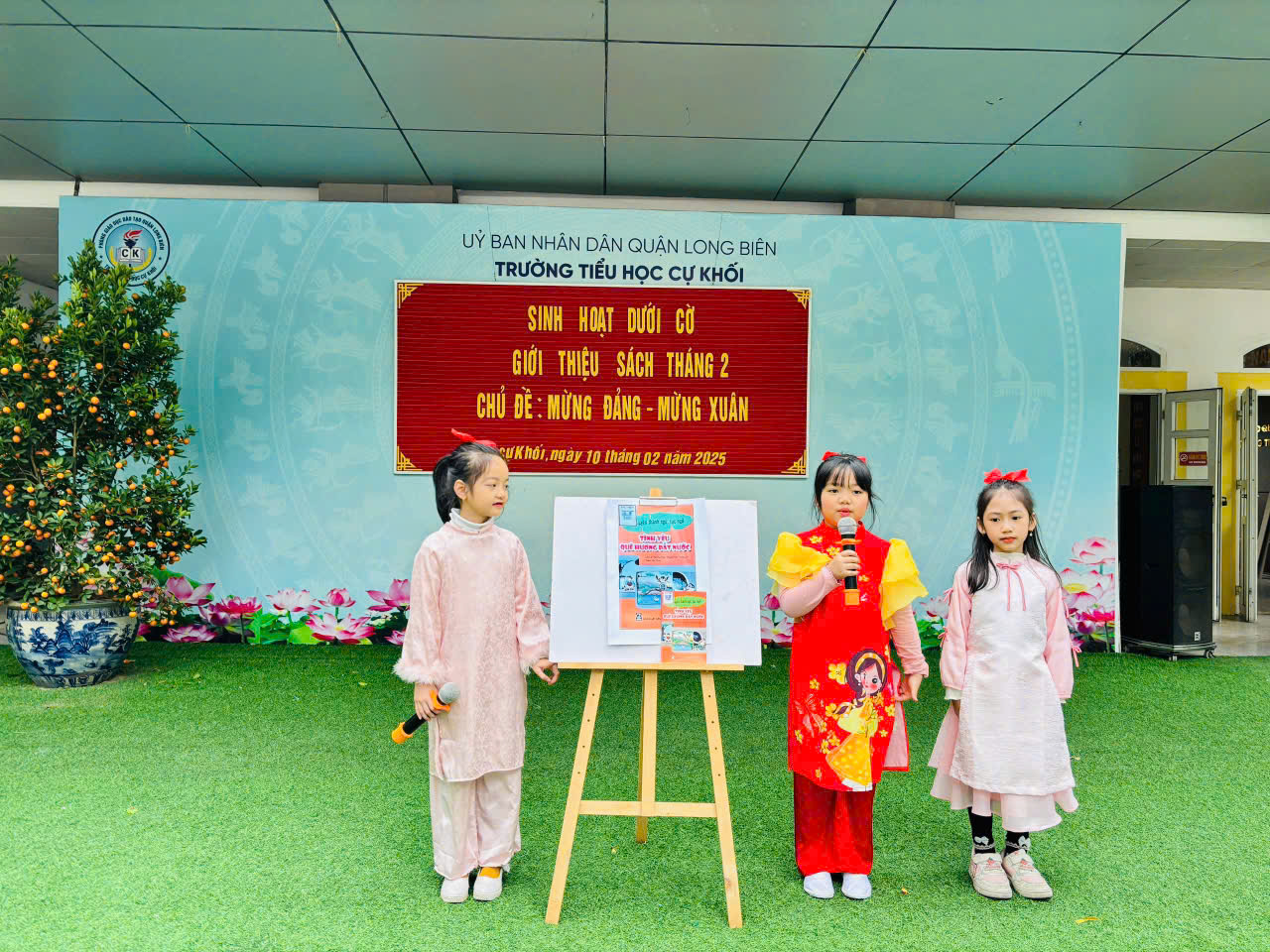 Sáng nay, ngày 10/2/2025, tiết sinh hoạt dưới cờ tại trường Tiểu học Cự Khối diễn ra trong không khí trang trọng với sự tham gia đông đủ của Ban giám hiệu, các cô giáo chủ nhiệm 27 lớp, các thầy cô dạy bộ môn cùng 1019 em học sinh toàn trường; đại diện học sinh lớp 2A3 đã tham gia giới thiệu sách với chủ điểm: Mừng Đảng - Mừng Xuân.