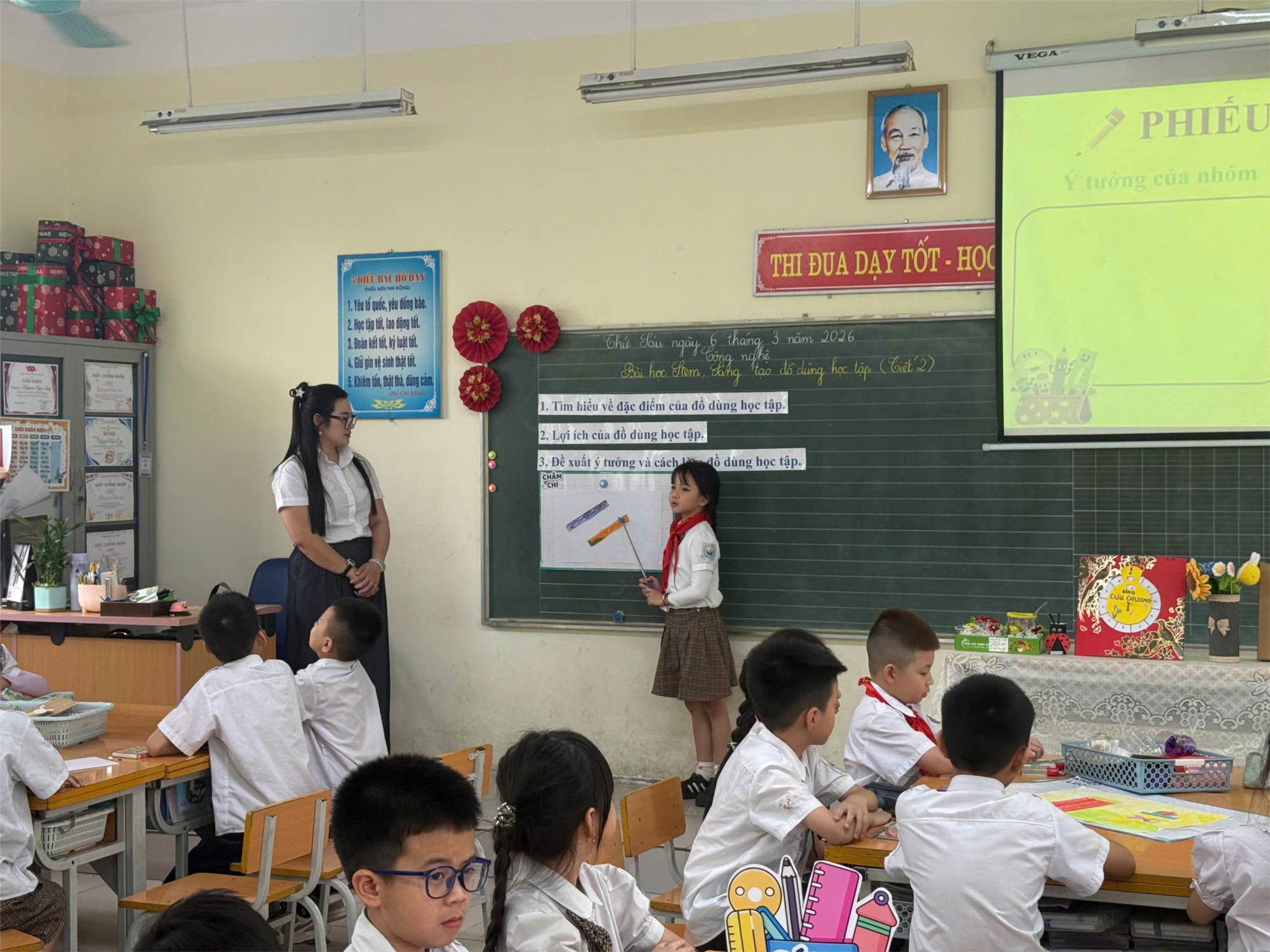 Với phong thái tự tin nhưng vô cùng gần gũi, cô giáo đã dẫn dắt các em học sinh đến với các nội dung học tập một cách mạch lạc, rõ các phần. Tiết học diễn ra sôi nổi với rất nhiều hình thức học tập như thảo luận nhóm, làm việc cá nhân, trao đổi cùng các bạn trước lớp. Các bạn nhỏ đã rất hào hứng học tập và chia sẻ tự tin sản phẩm mình làm ra.