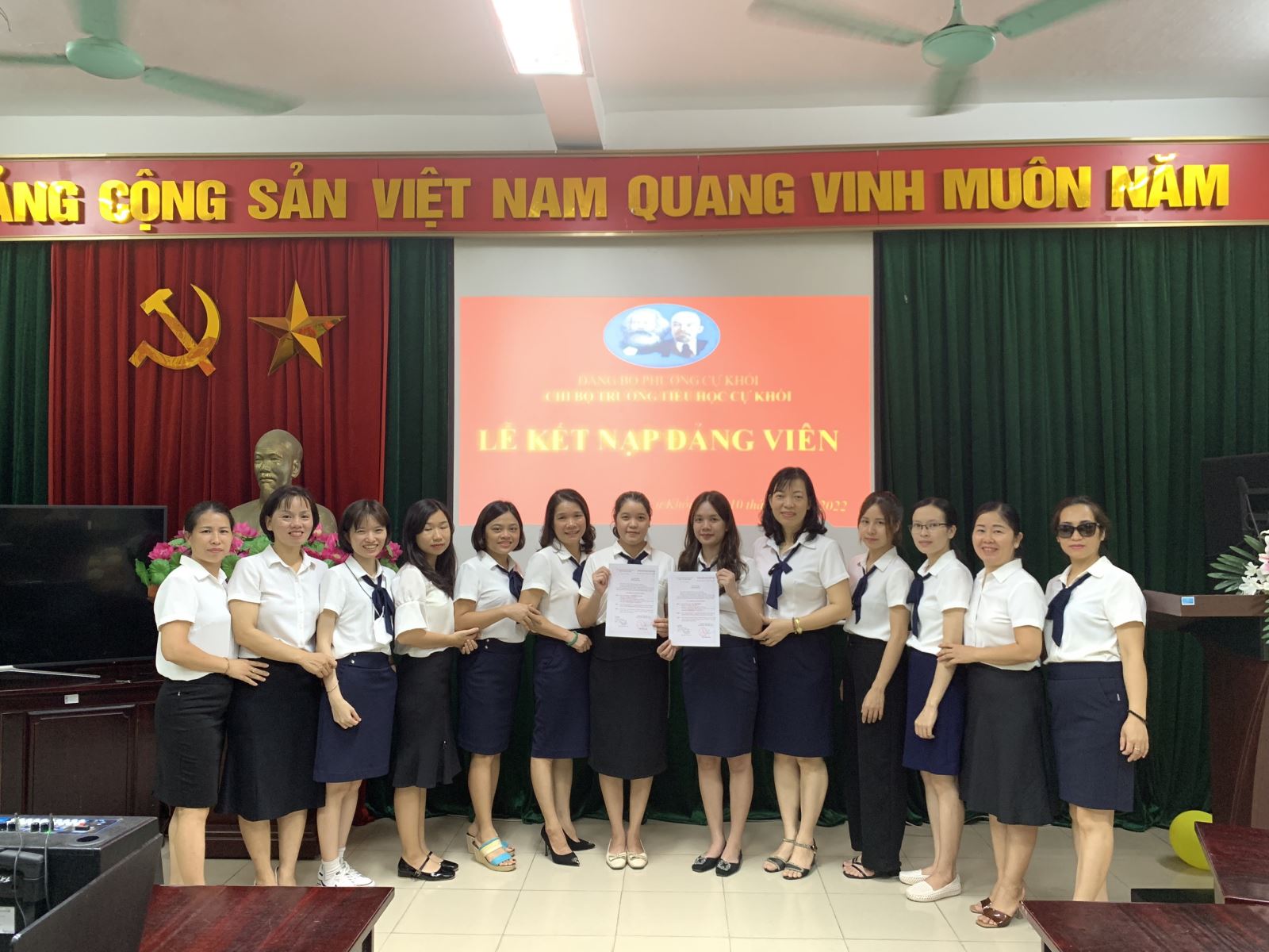 Lễ kết nạp được diễn ra trong không khí trang trọng, đúng quy định kết nạp Đảng viên mới với sự tham gia của toàn thể các Đảng viên trong chi bộ Trường Tiểu học Cự Khối. Tại buổi Lễ, đồng chí Hoàng Thị Bích Liên - Bí thư Chi bộ - đã trao Quyết định kết nạp số 917-QĐ/QU, ngày 14/7/222 của Quận uỷ Long Biên cho đồng chí Trịnh Hồng Hạnh, số 918-QĐ/QU ngày 14/7/222 của Quận uỷ Long Biên cho đồng chí Đào Thị Nhung.
