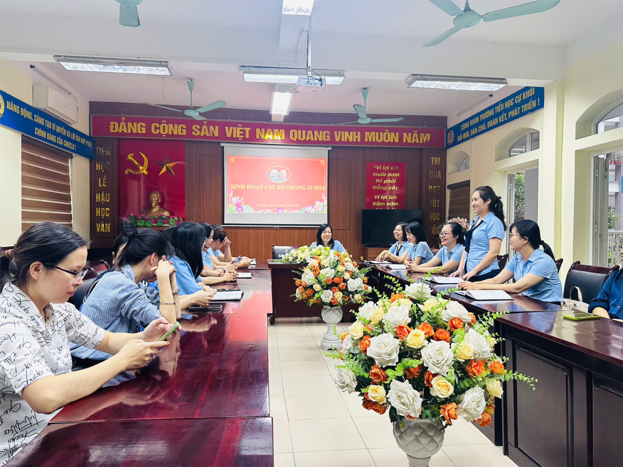 Trong buổi sinh hoạt, đồng chí Hoàng Thị Bích Liên - Bí thư chi bộ - Hiệu trưởng nhà trường đã triển khai các nội dung: Thông báo việc thực hiện việc thu nộp đảng phí, Nhận xét tình hình tư tưởng của đảng viên, Thông tin tình hình thời sự nổi bật, Thông qua các văn bản chỉ đạo của Đảng uỷ phường Cự Khối, Báo cáo Đánh giá kết quả thực hiện nhiệm vụ của chi bộ tháng 10 – Trình bày dự thảo nghị quyết tháng 11/2024. Tiếp theo, là phần thảo luận: chi bộ phát biểu ý kiến, tập trung trao đổi, thảo luận nội dung trọng tâm liên quan trực tiếp đến hoạt động của chi bộ; kết quả thực hiện nhiệm vụ được giao; các công việc trong công tác dạy và học; đánh giá việc học tập và làm theo tư tưởng và đạo đức Hồ Chí Minh đối với đảng viên trong chi bộ. Có 9 ý kiến tại hội nghị