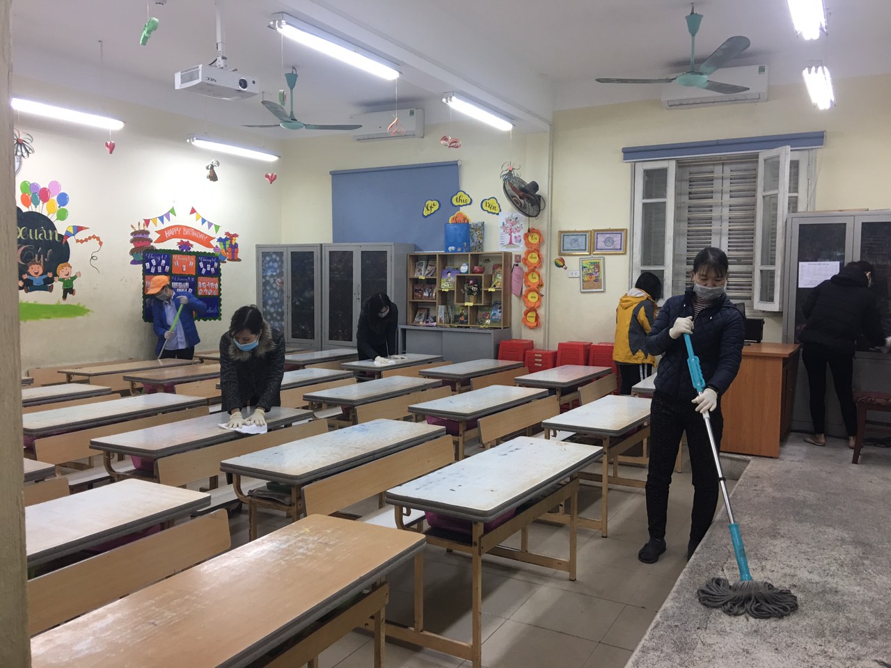 - Huy động 100% CBGVNV phối hợp cùng PHHS các lớp tham gia các buổi tổng vệ sinh trường lớp theo công văn chỉ đạo, tiến hành lau khử khuẩn các bề mặt tiếp xúc (bàn, ghế, sàn lớp, nhà VS) toàn trường với dung dịch Cloramin B 0.5%.