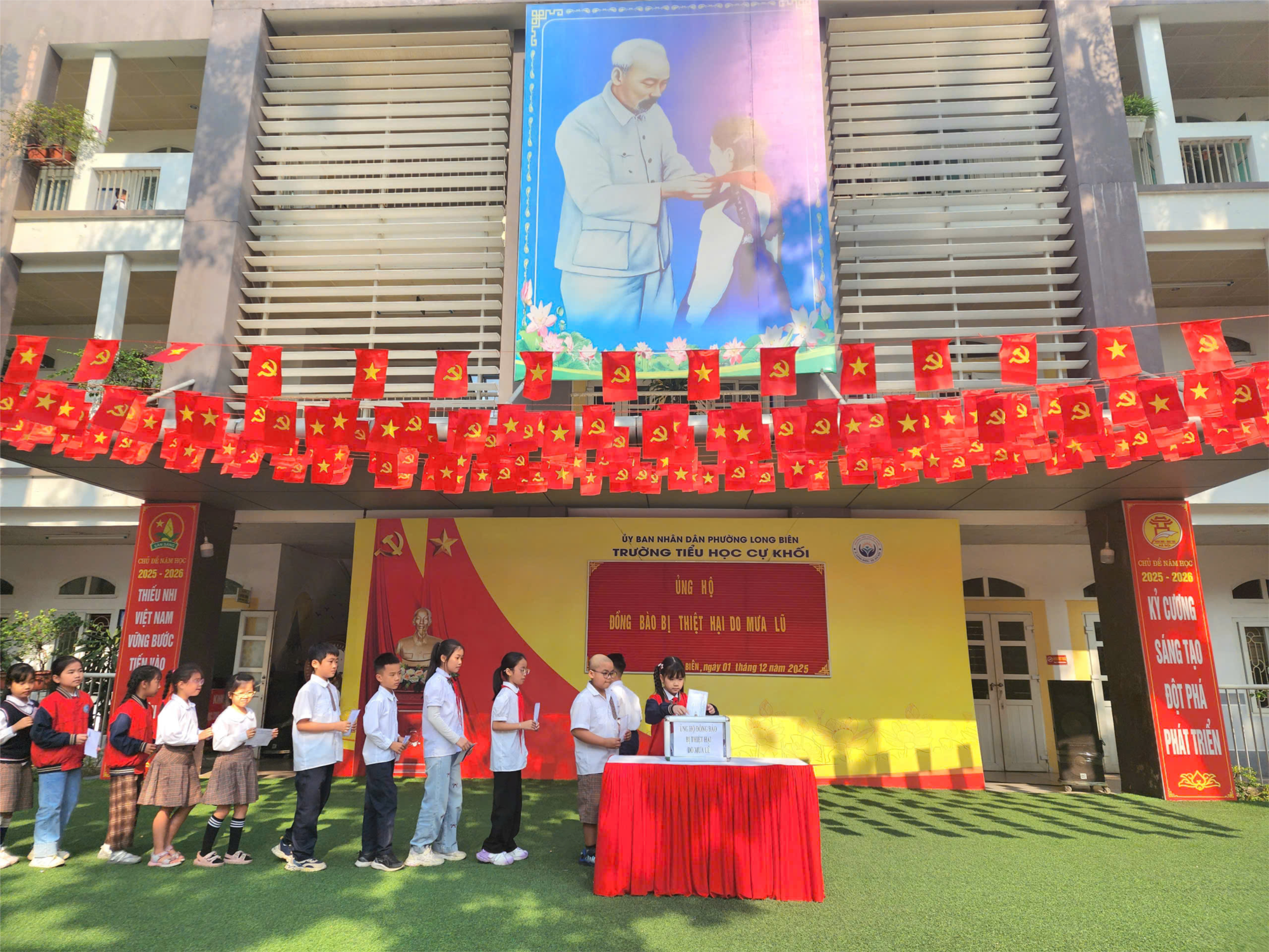 Hưởng ứng Công văn số 19/MTTQ-BTT ngày 22/11/2025 của Mặt trận Tổ quốc (MTTQ) phường Long Biên và Công văn số 4924/SGDĐT-CTTTHSSV ngày 24/11/2025 của Sở Giáo dục và Đào tạo Hà Nội về việc vận động ủng hộ đồng bào vùng lũ, Ban Giám hiệu Trường Tiểu học Cự Khối đã nhanh chóng triển khai, phát động phong trào đến toàn thể cán bộ, giáo viên, nhân viên, cha mẹ học sinh và các em học sinh trong toàn trường.