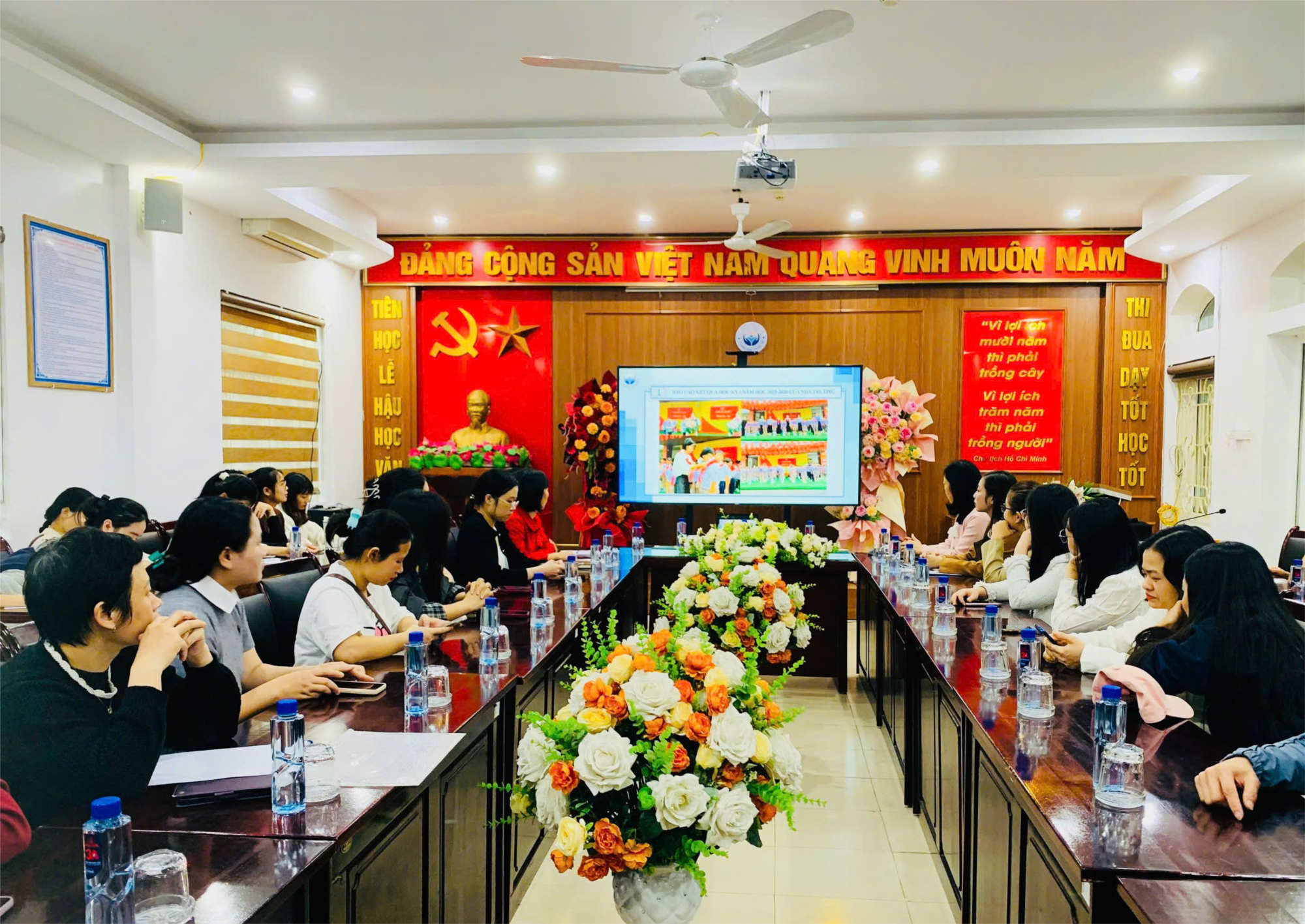 Tại Hội nghị, cô giáo Hoàng Thị Bích Liên – Bí thư Chi bộ, Hiệu trưởng nhà trường đã trình bày báo cáo sơ kết học kì I, trong đó nêu rõ những kết quả nổi bật nhà trường đã đạt được trên các mặt: công tác giảng dạy và học tập, giáo dục toàn diện học sinh, xây dựng nề nếp – kỷ cương trường học, cũng như những hoạt động phối hợp hiệu quả giữa nhà trường và cha mẹ học sinh. Bên cạnh đó, cô Hiệu trưởng cũng thẳng thắn chỉ ra một số khó khăn, tồn tại và định hướng các nhiệm vụ trọng tâm cho học kỳ II học 2025–2026.