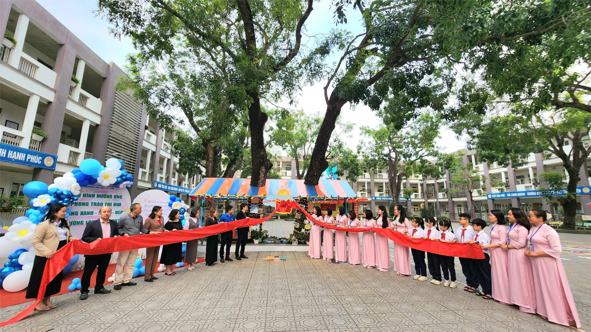 Đây được xem là điểm nhấn đặc biệt, ra đời với mong muốn tạo nên một không gian đọc sách gần gũi, nơi học sinh có thể tiếp cận, cảm nhận và sống cùng sách bằng tất cả giác quan – bằng mắt, tai và cảm xúc. Điểm nhấn đầy ý nghĩa trong “Khu vườn ước mơ” là những tấm bưu thiếp chúc mừng thầy cô được treo trên cành cây, những trái tim xinh xắn được gắn lên cây như những nhịp yêu thương không bao giờ tắt. Xung quanh công trình là những chậu cây xanh xinh xắn, được các lớp thay phiên chăm sóc.