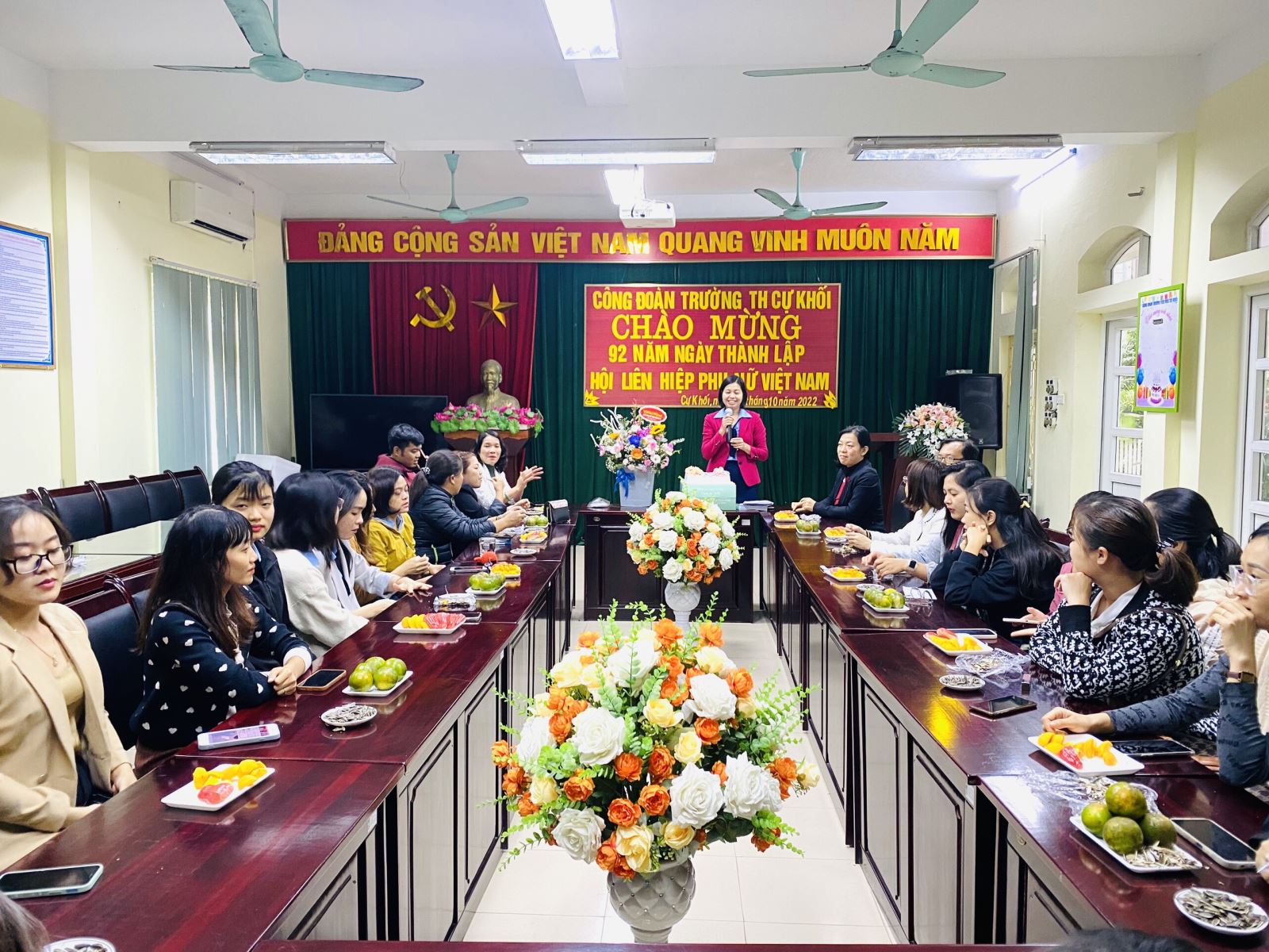 Hòa trong không khí cả nước hân hoan chào mừng ngày Phụ nữ Việt Nam, chiều ngày 20/10/2022, Ban giám hiệu cùng Công đoàn trường Tiểu học Cự Khối đã phối hợp tổ chức mít tinh kỷ niệm 92 năm ngày thành lập Hội Liên hiệp Phụ nữ Việt Nam (20/10/1930 -20/10/2022).
