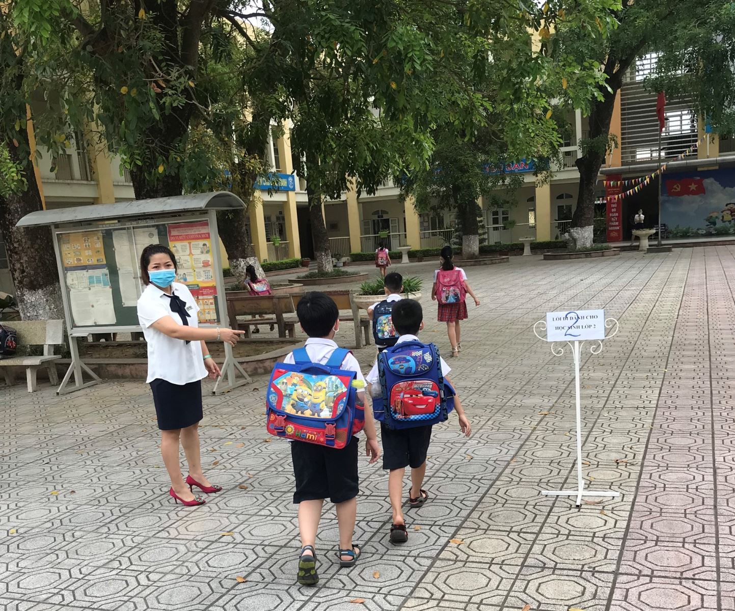 Phía trong cổng trường được chia làm 5 lối đi dành cho các khối, tại mỗi lối đi đều có giáo viên chỉ dẫn và nhắc học sinh rửa tay khử khuẩn trước khi vào lớp. Mặc dù phải dậy sớm hơn so với mọi khi, tuy nhiên các em học sinh đều rất hào hứng khi được gặp lại thầy cô và bạn bè. Cô trò được gặp nhau, nét mặt ai cũng rạng ngời khó tả. Trong sắc trắng đồng phục giản dị của nhà trường, các cô trong Ban giám hiệu cũng xuống tận cổng trường để đón những cô cậu học trò nhỏ.