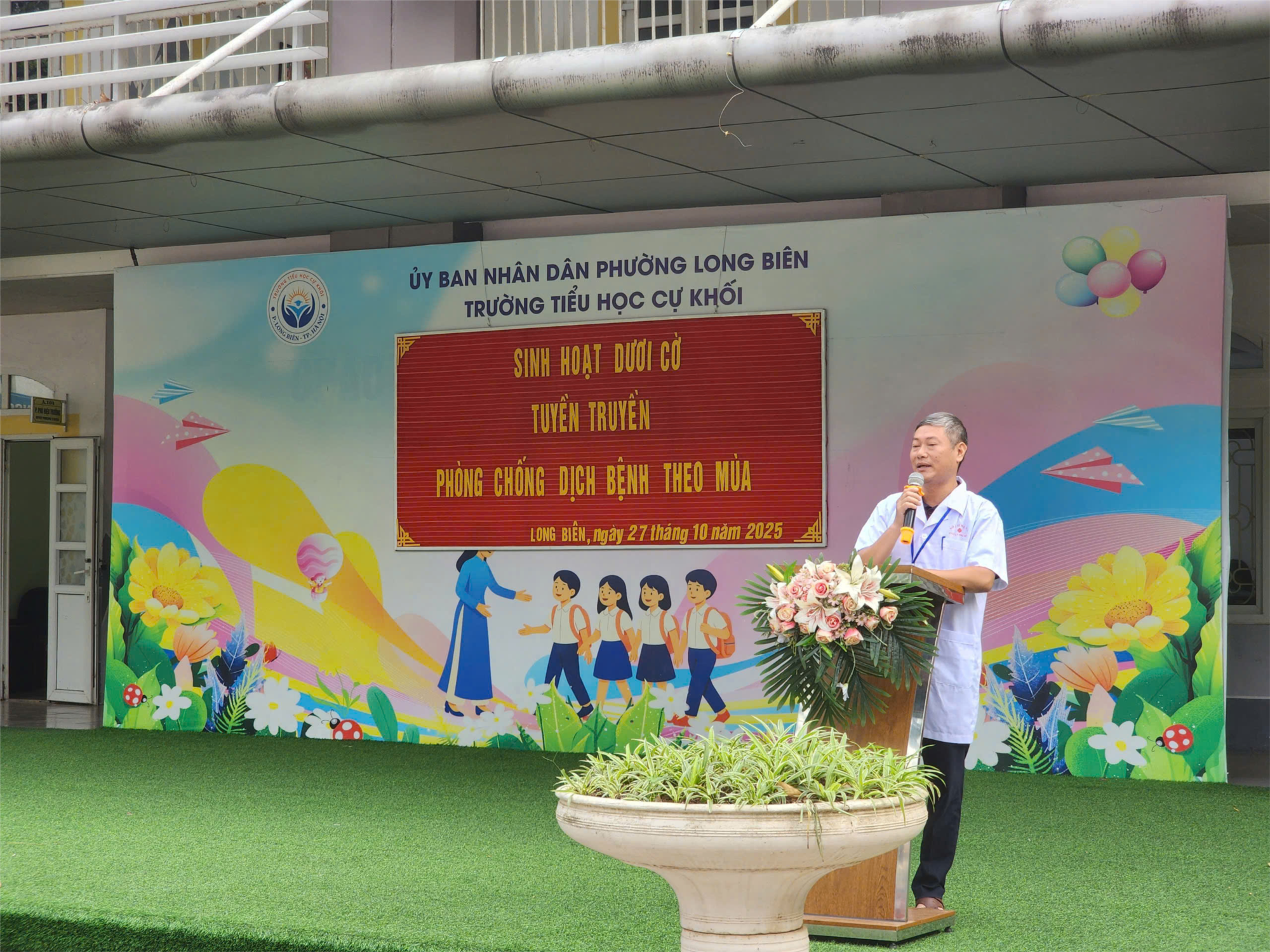Sáng ngày 27/10/2025, thực hiện kế hoạch số 30/KH-THCK ngày 05 tháng 9 năm 2025 về Kế hoạch Triển khai công tác Y tế học đường năm học 2025-2026 và kế hoạch số 54/KH-THCK ngày 08 tháng 9 năm 2025 về Đảm bảo an toàn thực phẩm, phòng chống dịch bệnh trong trường học năm học 2025-2026, trường Tiểu học Cự Khối đã tổ chức buổi tuyên truyền phòng chống dịch bệnh theo mùa cho toàn thể cán bộ, giáo viên, nhân viên và học sinh trong nhà trường.